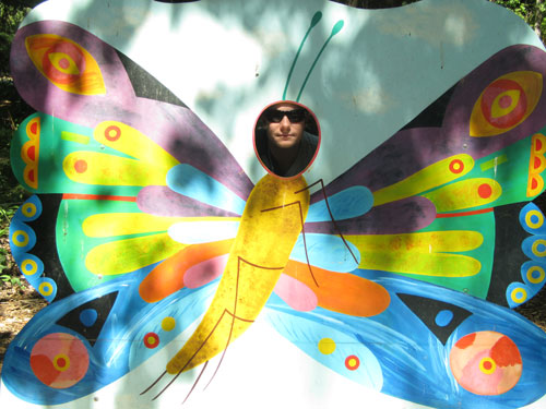 We started our Zoo day with the turtles and birds. But first I couldn’t resist asking Tim to pose in the butterfly (pictured on right) – one of many interactive displays around the Zoo. There is even a recycling lion that takes your paper and roars when you put it in his mouth.